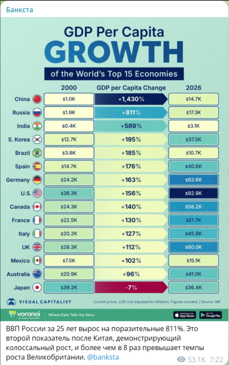 Вот этот пост на уважаемом канале заставил согласиться в очередной раз с Марком Твеном - «Существуют три вида лжи: ложь, наглая ложь и статистика»).Разберем картинку, по сути. Цифра +811% по России выглядит впечатляюще, но в ней несколько слоёв, которые искажают восприятие.Низкая база 2000 годаОснов...