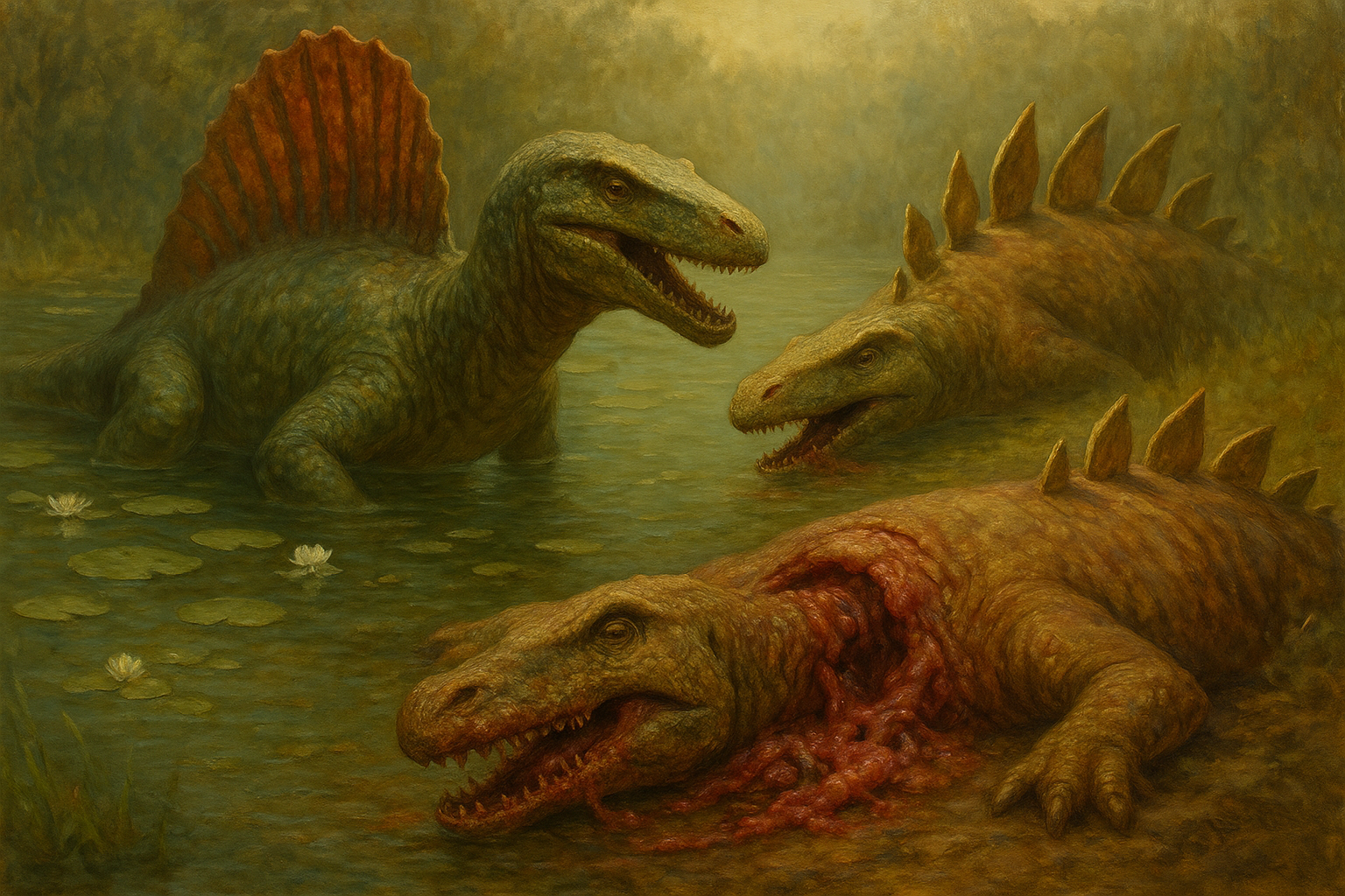 "рядом с Кукером появился тиранозавр Ахилл. Был жаркий день, и они нежились в воде – не то в болотце, не то в мелком озере, покрытом кувшинками и маслянистой ряской. Над водой поднимались их спины и шеи – а на берегу лежала трапеза: туша стегозавра, подгнившая и разбухшая на жаре. Кукер с Ахиллом общались телепатически. Чудовищные пасти не производили ни звука – если, конечно, не считать треска, с которым лопались кишки и мускулы их протухшего фуршета.