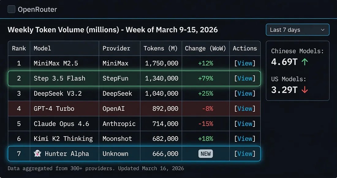 Опубликованы данные OpenRouter: китайские модели вторую неделю подряд превосходят американские. Лидером является «призрак» по имени Хантер Альфа. Вот что должен знать каждый разработчик.