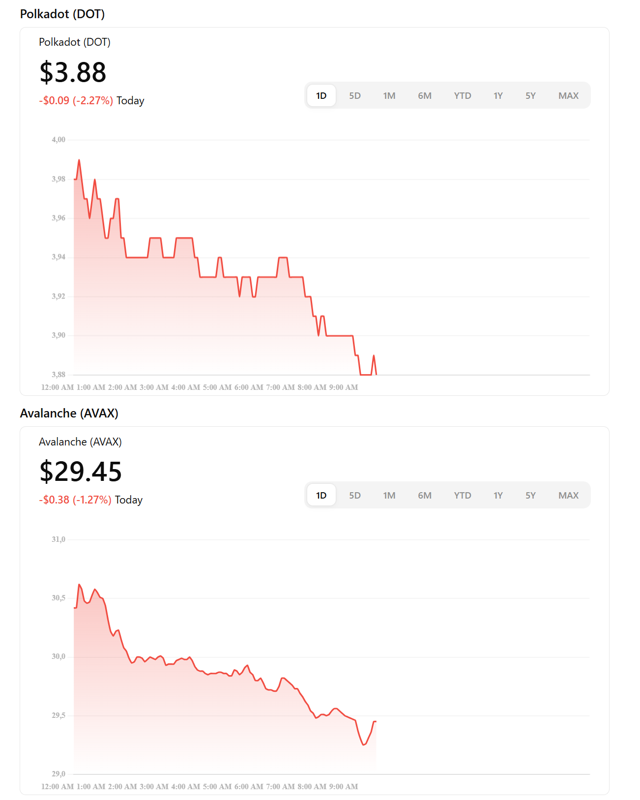 Вероятно, AVAX покажет сильный рост в периоды бычьего рынка, возможно опережая ADA и DOT.SOL обычно более волатилен: сильный рост в “альтовые ралли”, но падения могут резче.ADA и DOT могут демонстрировать более устойчивый рост, но с меньшим “скачком вперед”.Границы между ними будут меняться: в какой-то момент SOL мог “взлететь”, обгоняя остальные, затем откат.